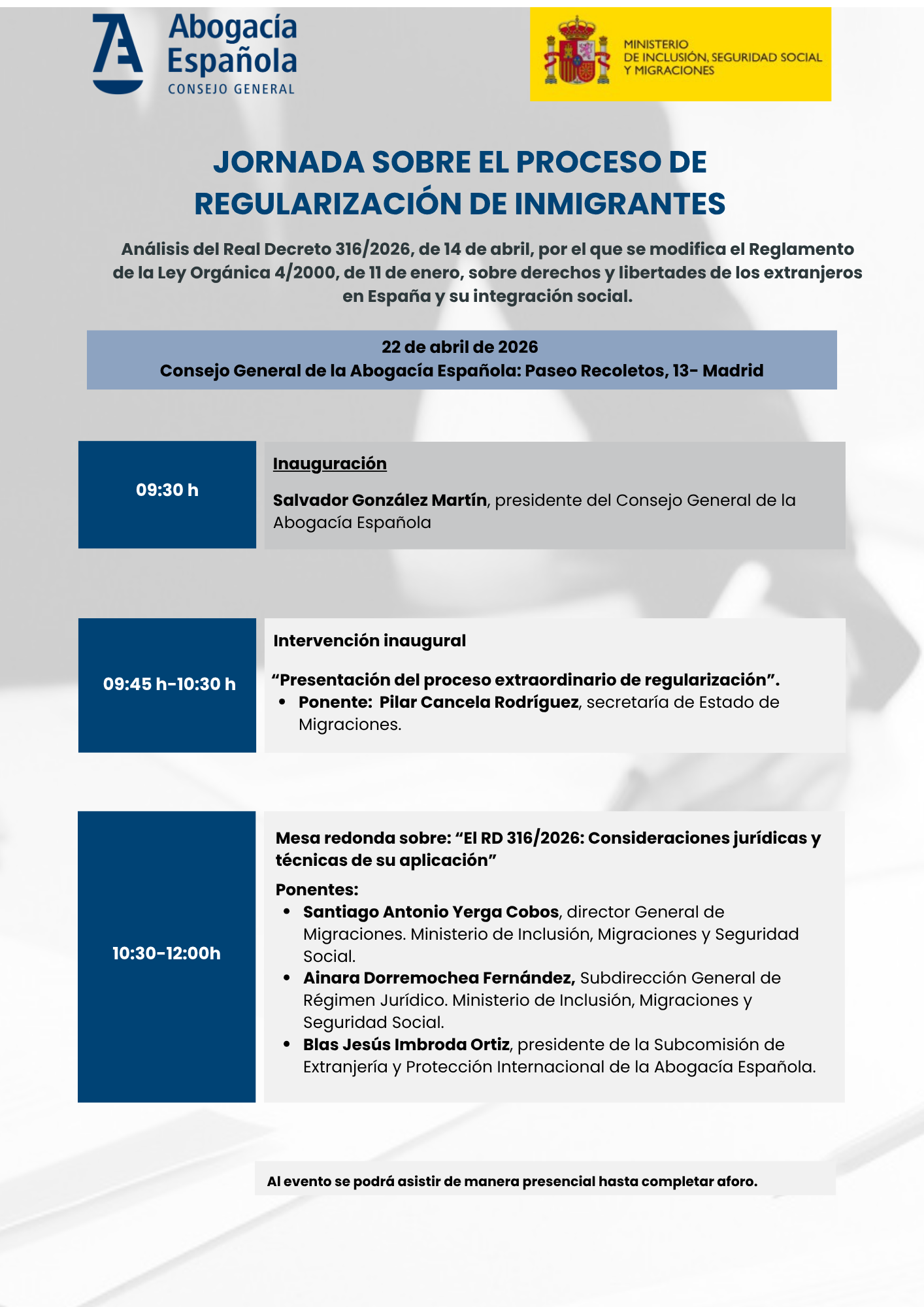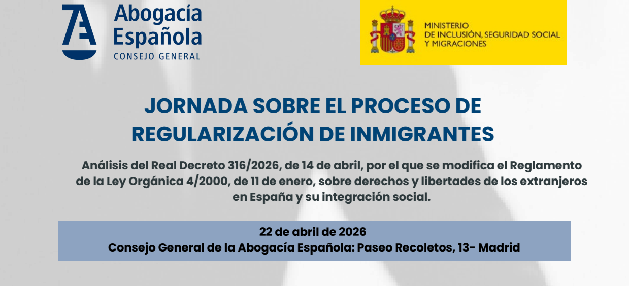 Tras la publicación del Real Decreto 316/2026, de 14 de abril, por el que se regula la regularización extraordinaria de personas migrantes aprobada por el Gobierno y, dentro del marco de colaboración y coordinación institucional establecido entre el Consejo General de la Abogacía Española y el Ministerio de Inclusión, Seguridad Social y Migraciones, este miércoles 22 de abril a las 9:30 horas se va a celebrar, en la sede del Consejo (Paseo de Recoletos nº 13 de Madrid), una jornada para explicar este proceso de regularización.