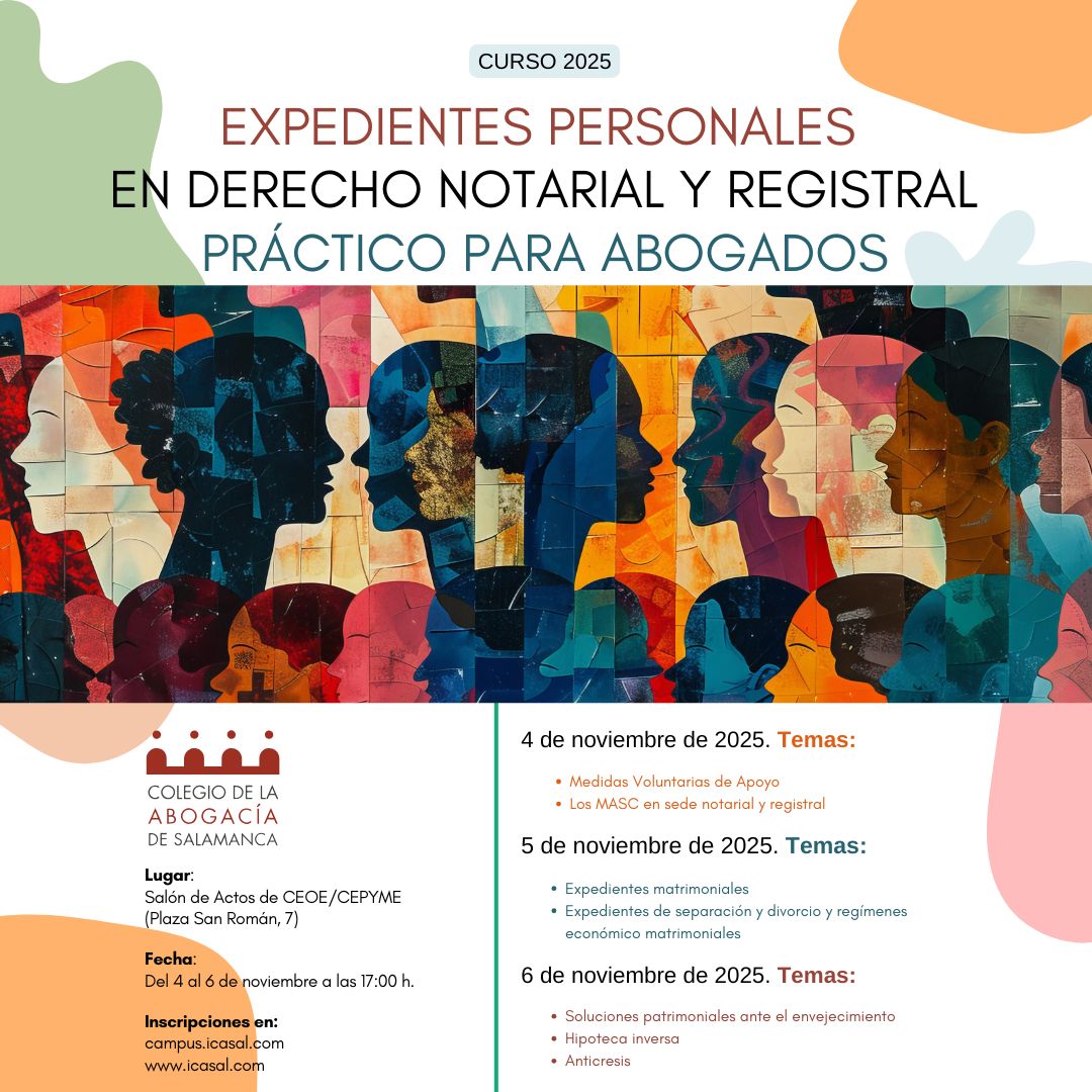 El conocimiento de los expedientes personales en el ámbito notarial y registral resulta cada vez más relevante para la práctica profesional de la abogacía. La entrada en vigor de la Ley 8/2021, las reformas en materia de capacidad jurídica, familia y envejecimiento, así como la creciente utilización de los MASC en sede notarial y registral, exigen del profesional una comprensión actualizada de estos procedimientos y de su coordinación con la actividad jurisdiccional.