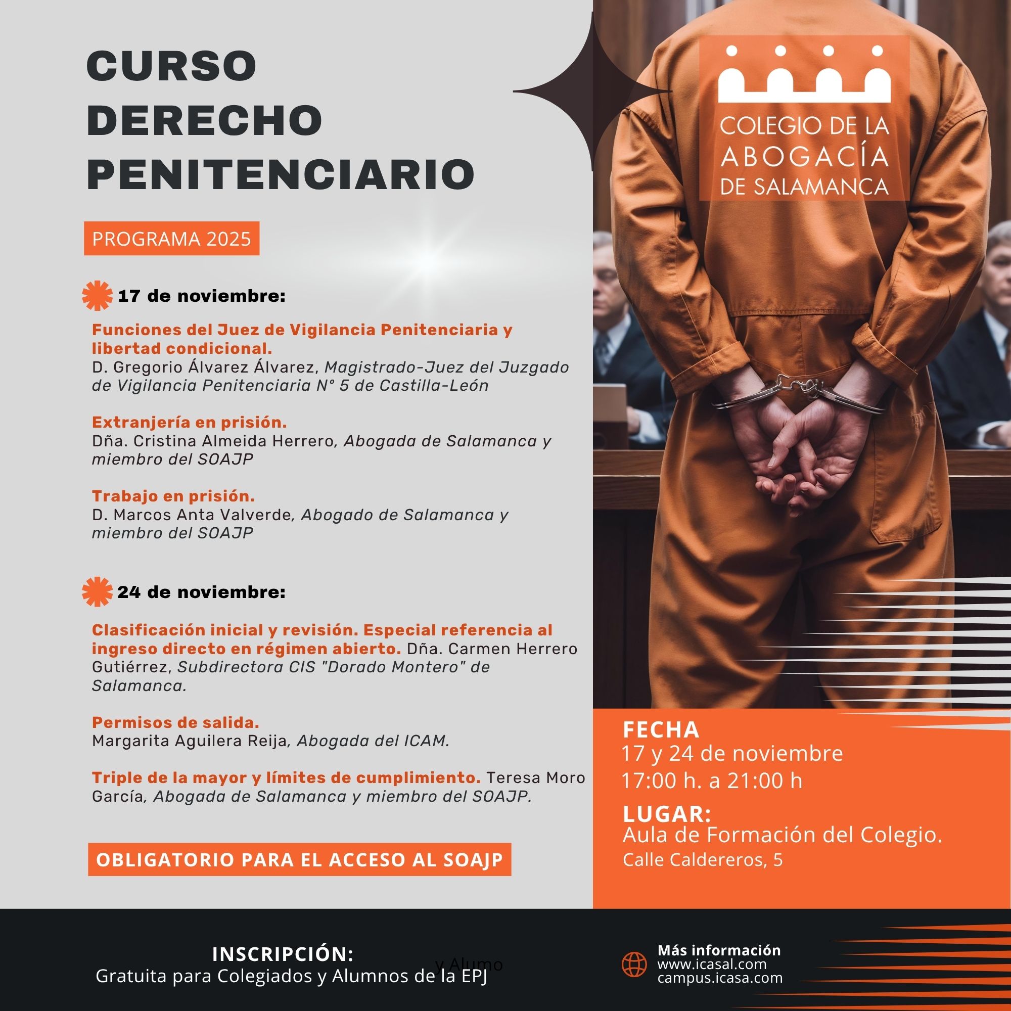 Con este propósito, el Colegio de la Abogacía de Salamanca organiza el Curso Derecho Penitenciario 2025, que se celebrará los días 17 y 24 de noviembre, en horario de 17:00 a 21:00 horas, en el Aula de Formación del Colegio (entrada por C/ Caldereros). El curso tendrá una duración total de ocho horas, distribuidas en dos sesiones presenciales.