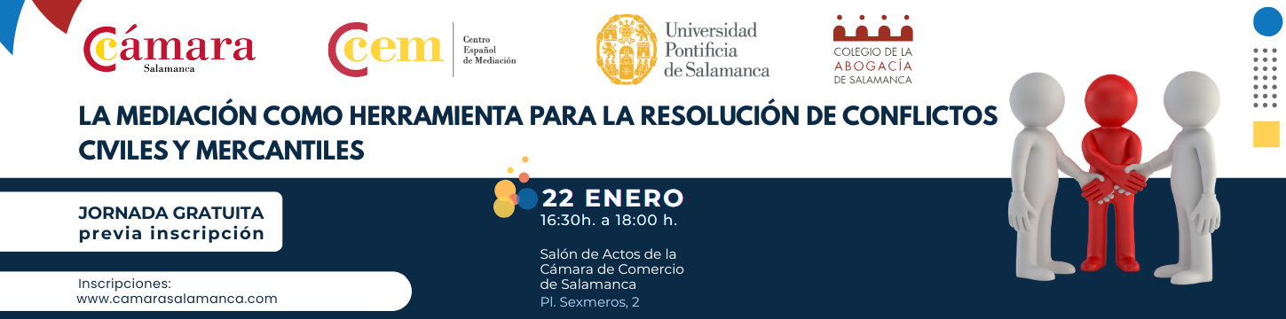 El Ilustre Colegio de la Abogacía de Salamanca, la Cámara de Comercio de Salamanca, el Centro Español de Mediación y la Universidad Pontificia de Salamanca se unen el próximo 22 de enero para analizar «la mediación como herramienta para la resolución de conflictos civiles y mercantiles» tras el primer año de vigencia de la reforma procesal.