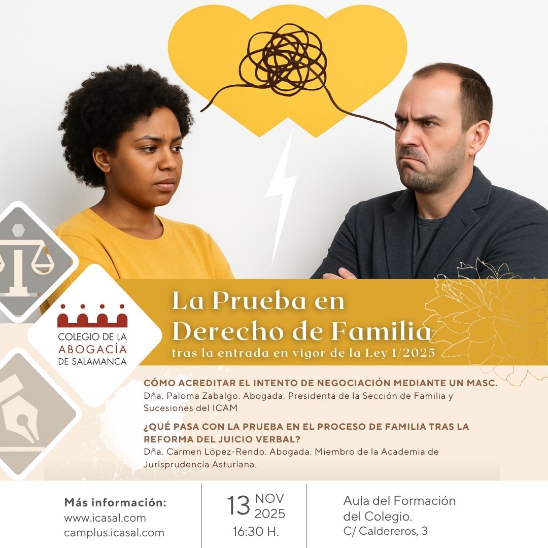 Para ayudarnos a comprender los nuevos desafíos probatorios marcados por la Ley 1/2025, desde la Sección de Derecho de Familia en colaboración con la Comisión de Formación, hemos organizado el próximo día 13 de noviembre, unas Jornadas sobre “LA PRUEBA EN DERECHO DE FAMILIA TRAS LA ENTRADA EN VIGOR DE LA LEY 1/2025” , en las que contaremos con grande profesionales, como Paloma Zabalgo y Carmen López-Renedo, compañeras especializadas en la materia y tendremos oportunidad de intercambiar experiencias sobre nuestra práctica diaria como abogados.