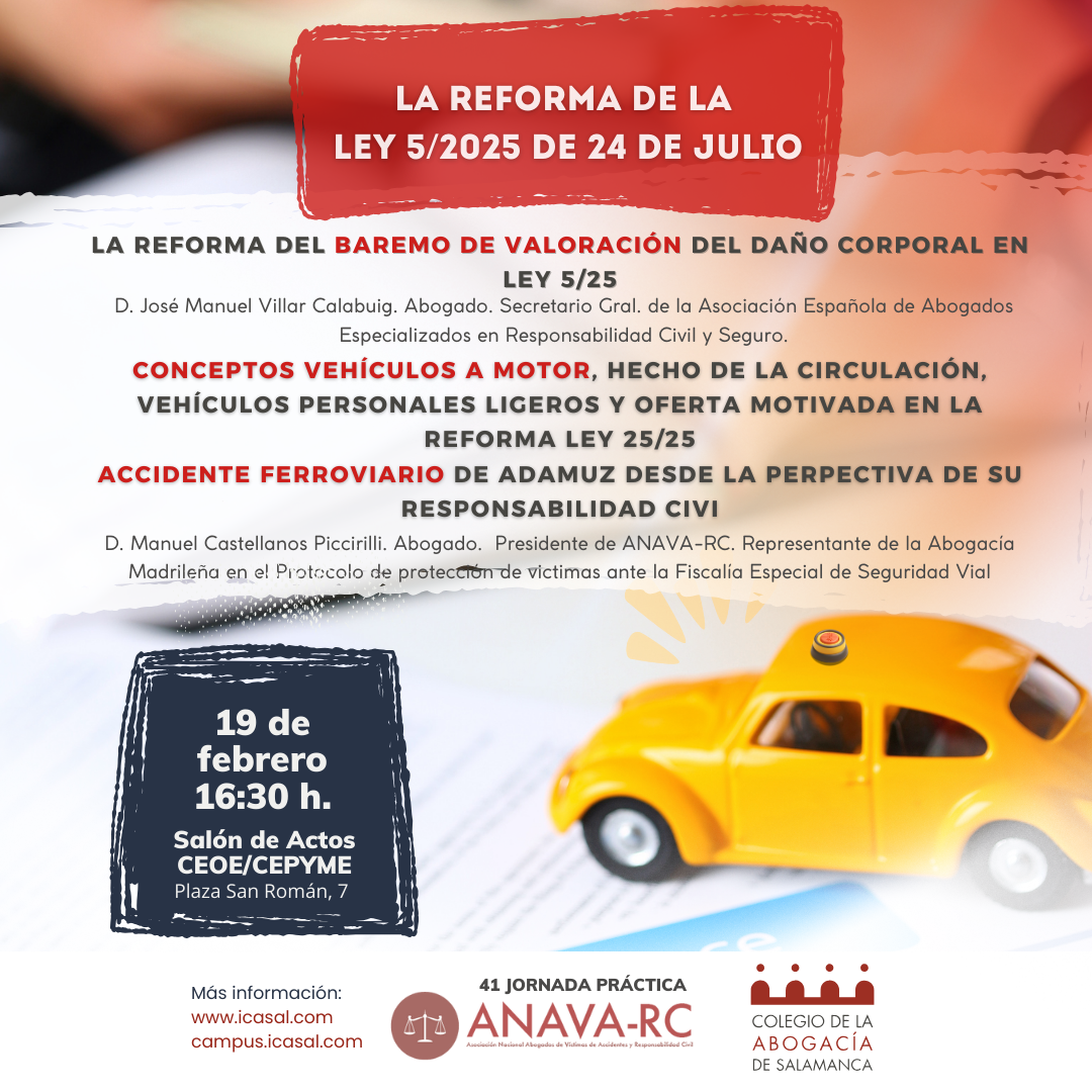 El próximo 19 de febrero de 2026, el Colegio de la Abogacía de Salamanca y ANAVA-RC celebran la 41ª Jornada Práctica de Formación sobre la Reforma de la Ley 5/2025, de 24 de julio. Este encuentro, que tendrá lugar a las 16:30 horas en el Salón de Actos de CEOE CEPYME (Plaza San Román, 7), nace con el objetivo de dotar a los profesionales de herramientas reales ante el nuevo escenario legal de la Responsabilidad Civil y el Seguro.