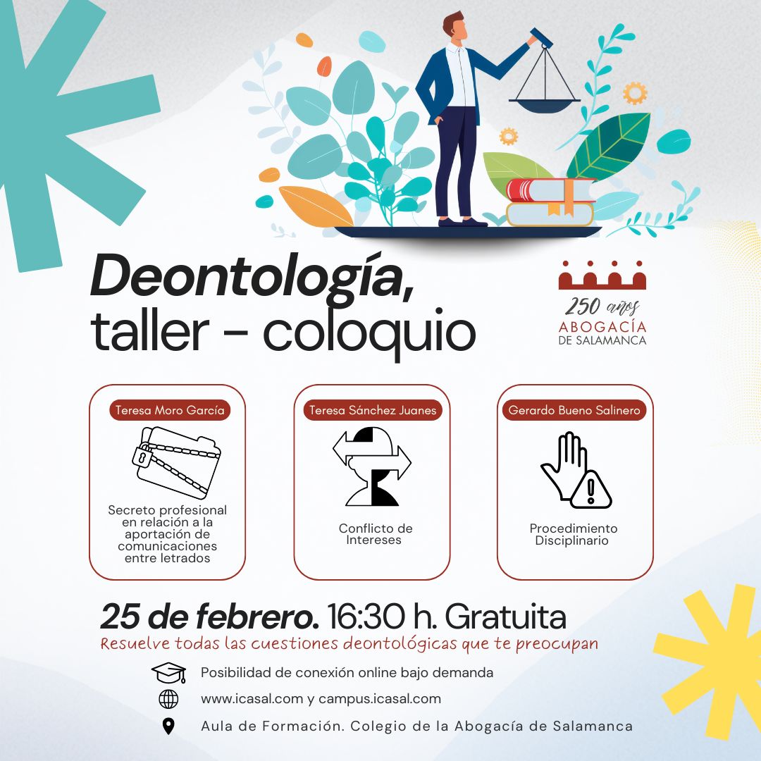 El próximo 25 de febrero a las 16:30 en el Aula de Formación del Colegio tendrá lugar un “Taller de Deontología” La jornada será moderada por Inés Blanco e impartido por miembros de la comisión colegial, donde se expondrán una serie de temas y se resolverán todas las dudas que se planteen al respecto.